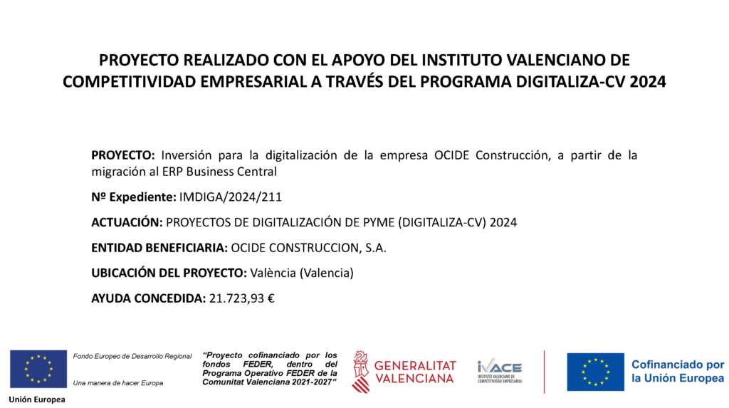 En 2024/25 se desarrolló dentro del proyecto de digitalización de PYME (DIGITALIZA-CV) 2024, el proyecto para la digitalización de OCIDE, a partir de la migración al ERP Business Central